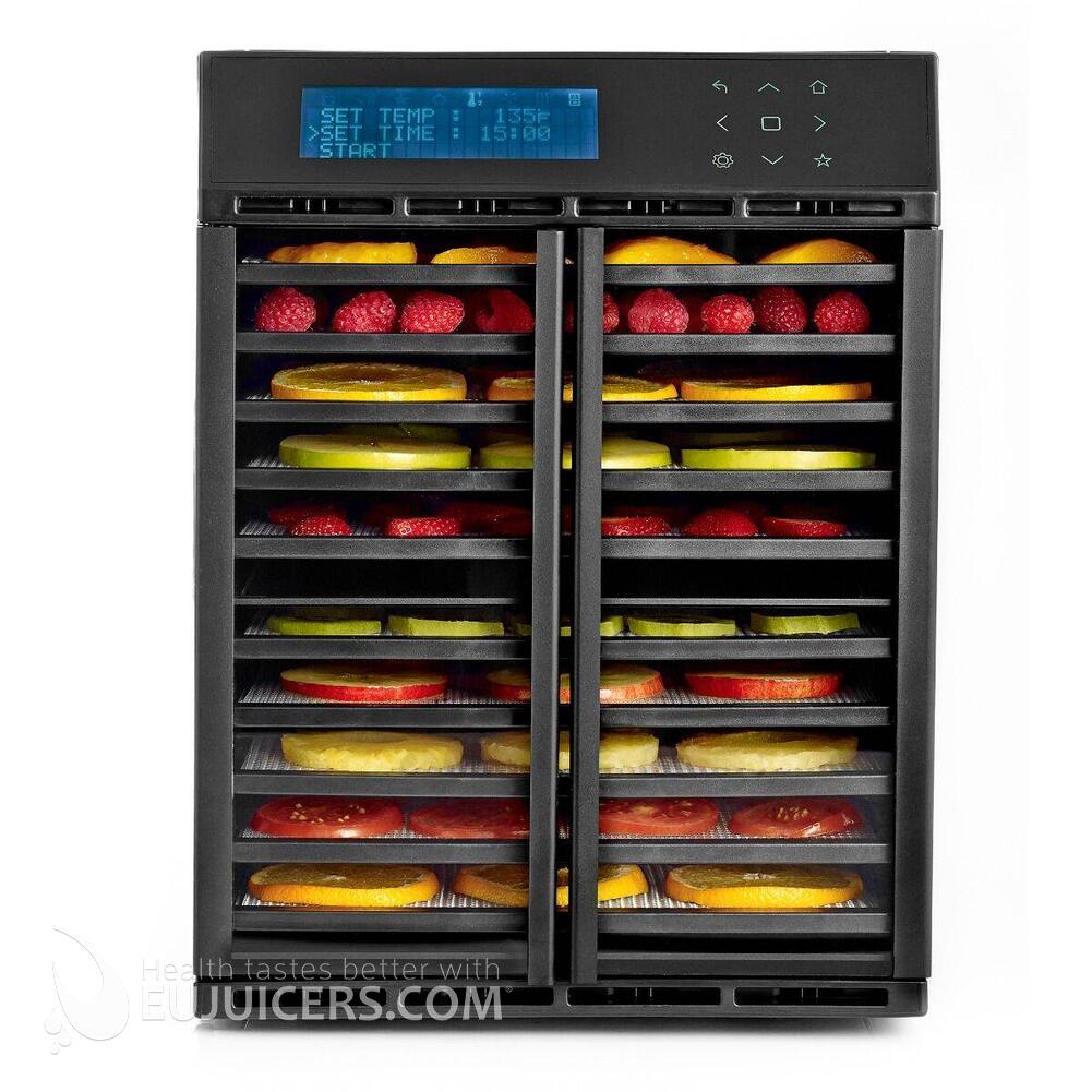 Un separator interior orizontal detașabil vă permite să creați o zonă de uscare superioară și una inferioară, fiecare cu ventilatorul și termostatul său. Acest lucru vă oferă flexibilitatea maximă cu ingredientele. Puteți usca merele în camera inferioară cu propriile setări de timp și temperatură, în timp ce uscați carne de vită pentru pastramă la o temperatură mai mare în camera superioară. Comenzile digitale cu un afișaj albastru, ușor de citit, fac programarea rapidă și simplă. Fiecare zonă poate fi setată pentru 1 sau 2 timpi de uscare și 1 sau 2 setări de temperatură pentru necesități variabile de uscare a alimentelor și pentru a accelera procesul de uscare. De asemenea, puteți programa și salva 30 de rețete preferate.